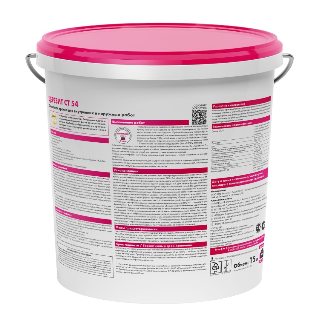 Описание товара: "Краска силикатная Ceresit СТ 54 водно-дисперсионная база (15 л)"