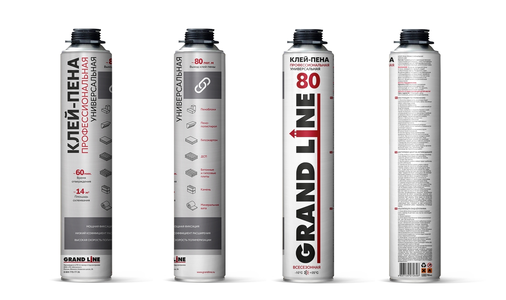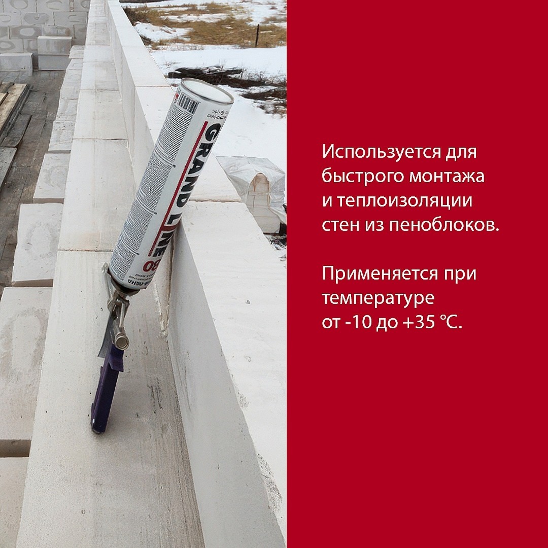 Клей-пена профессиональная Grand Line применяется согласно инструкции приведенной на баллоне при температуре от -10 °С до +35°С.